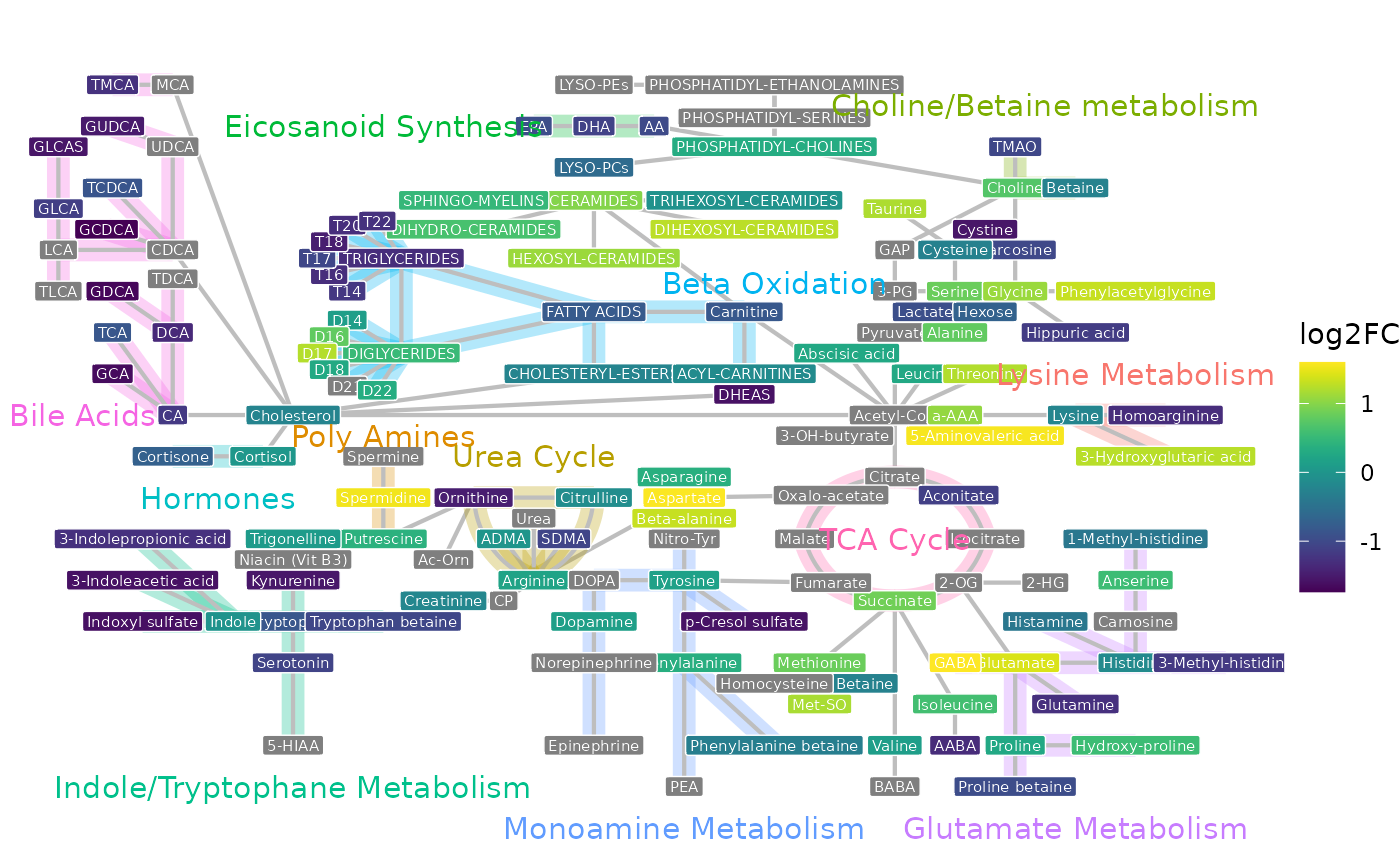 user_guide.RmdThe MetAlyzer R-package provides a robust toolkit for importing, handling, and analyzing metabolomics data generated using either the Biocrates Quant500L™ or Quant500XL™ kit and the Biocrates WebIDQ™ software (BIOCRATES Life Sciences AG, Innsbruck, Austria). It structures the data into a SummarizedExperiment (SE) (Morgan et al. 2025) object, facilitating integration with Bioconductor workflows and enabling downstream statistical analysis and visualization. To aid in biological interpretation, MetAlyzer offers functions to generate key visualizations. These include scatter plots with information about the metabolite classes as assigned by BIOCRATES Life Sciences AG and a network plot, which readily visualizes the whole metabolite space of the kit and colour codes the metabolites that are detected for e.g. Log2FC differences between conditions of interest. These network visualizations are crucial for understanding the complex interconnections between metabolites, helping to find pathway-level alterations and providing a systems perspective on the metabolic response under investigation.
