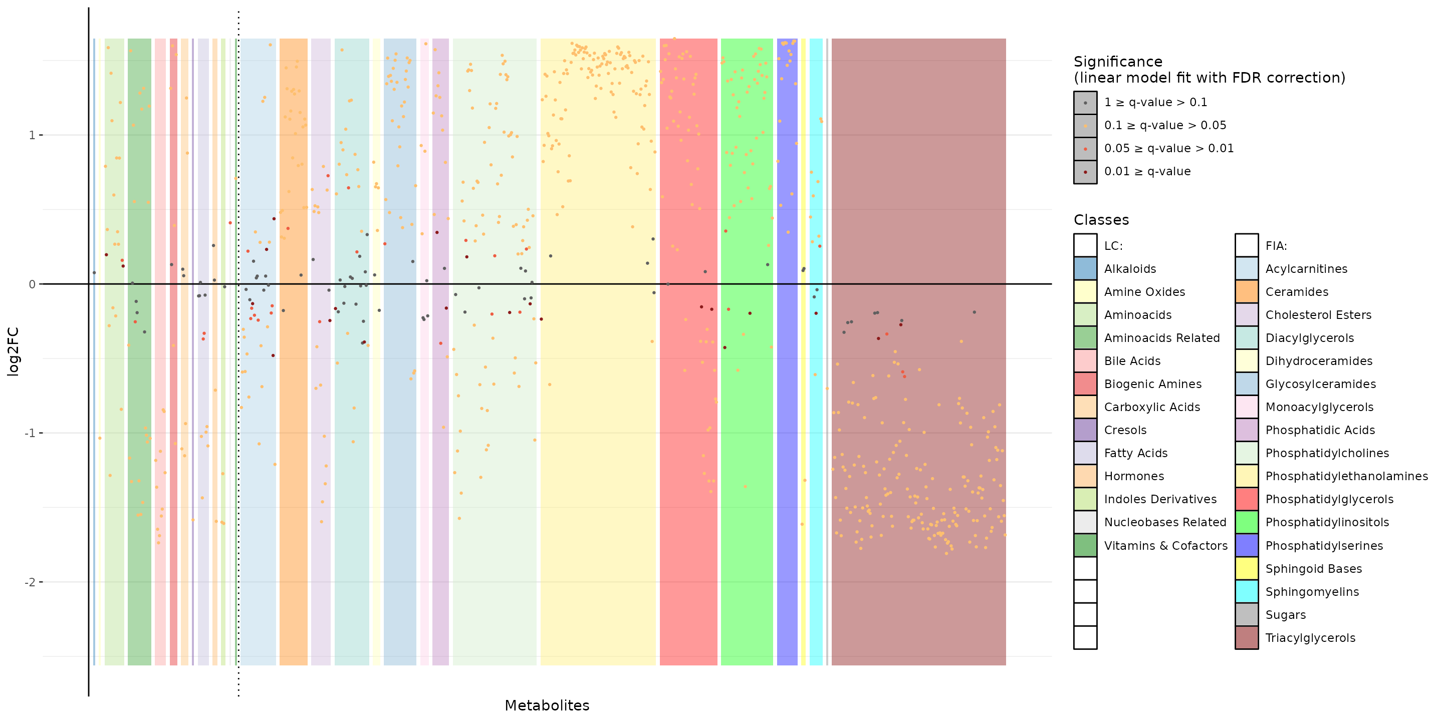 kableExtra::kable_classic(full_width = F, html_font = "Cambria", font_size = 12)| Metabolite | Class | log2FC | pval | qval |